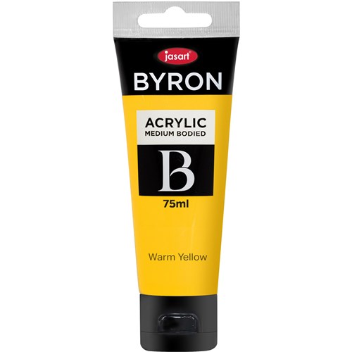 Jasart Byron is a medium bodied acrylic The colours are bright, intense and permanent after they have dried Can be used on most surfaces such as paper, canvas, wood, glass, plastic and more Warm and Cool Primary colours will allow you to have a superior colour mixing Non toxic 75ml tubes available in 30 colours including 4 fluoro colours and 2 metallic colours Each individual tube is foil sealed Also available in 1 Litre bottles in 23 colours including 2 metallic colours.