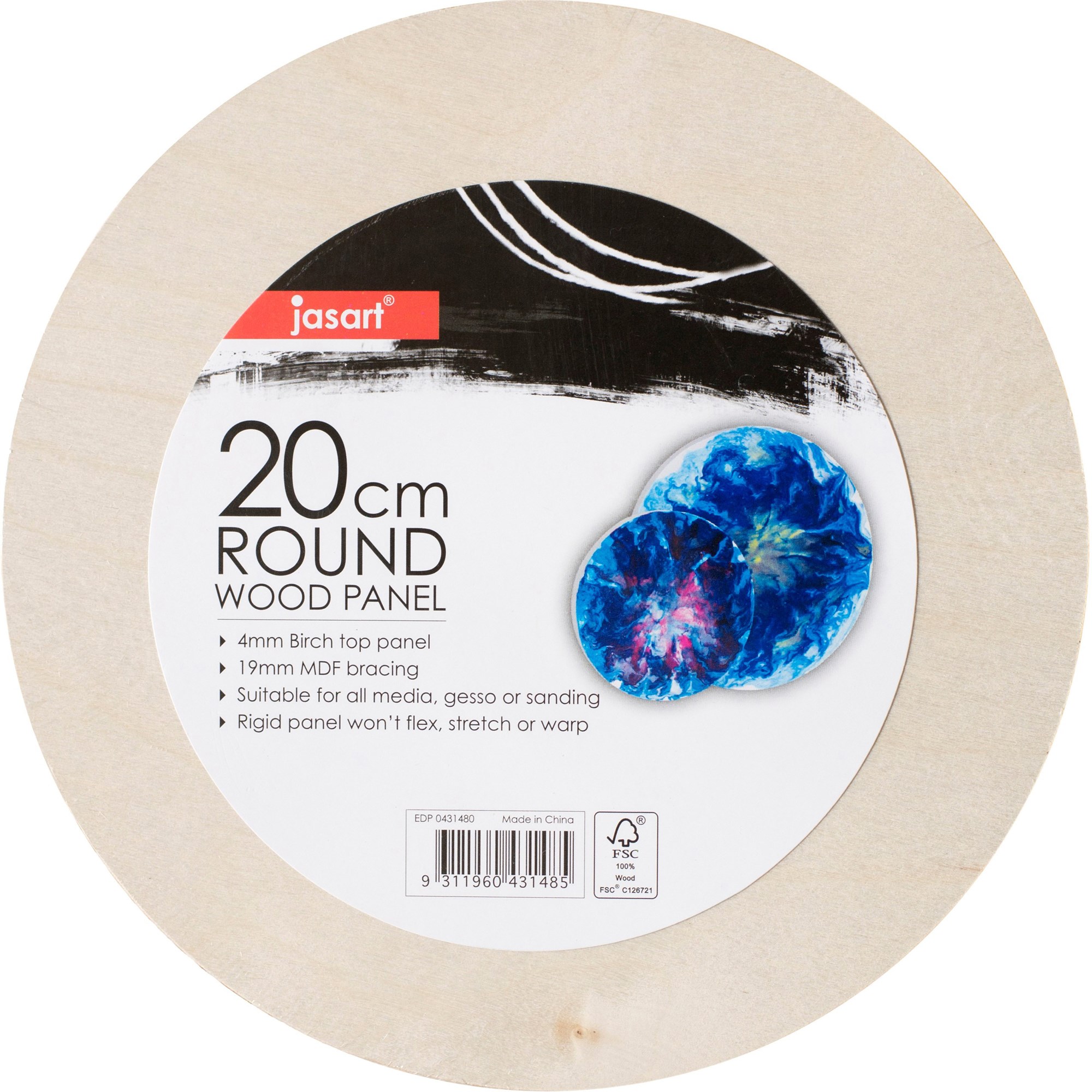 A smooth, solid and sanded un-primed painting surface. Rigid Birchwood top panel mounted on 23mm base brace. Suitable for all media, gesso or sanding. Excellent quality. Avaialbe in sizes 20 to 90cm diameter. FSC certified.