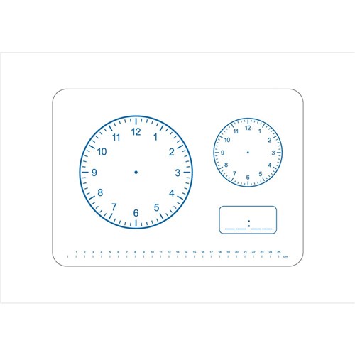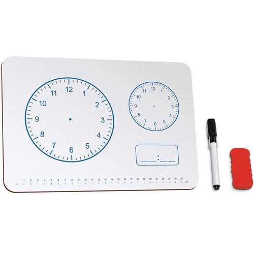 299W x 3D x 212mmH. Great learning aid for kids. Supplied with whiteboard marker and eraser. Reverse side can be used as a plain whiteboard. Features large and small analogue clock faces and a single digital clock. Pre-printed ruler up to 25cm.