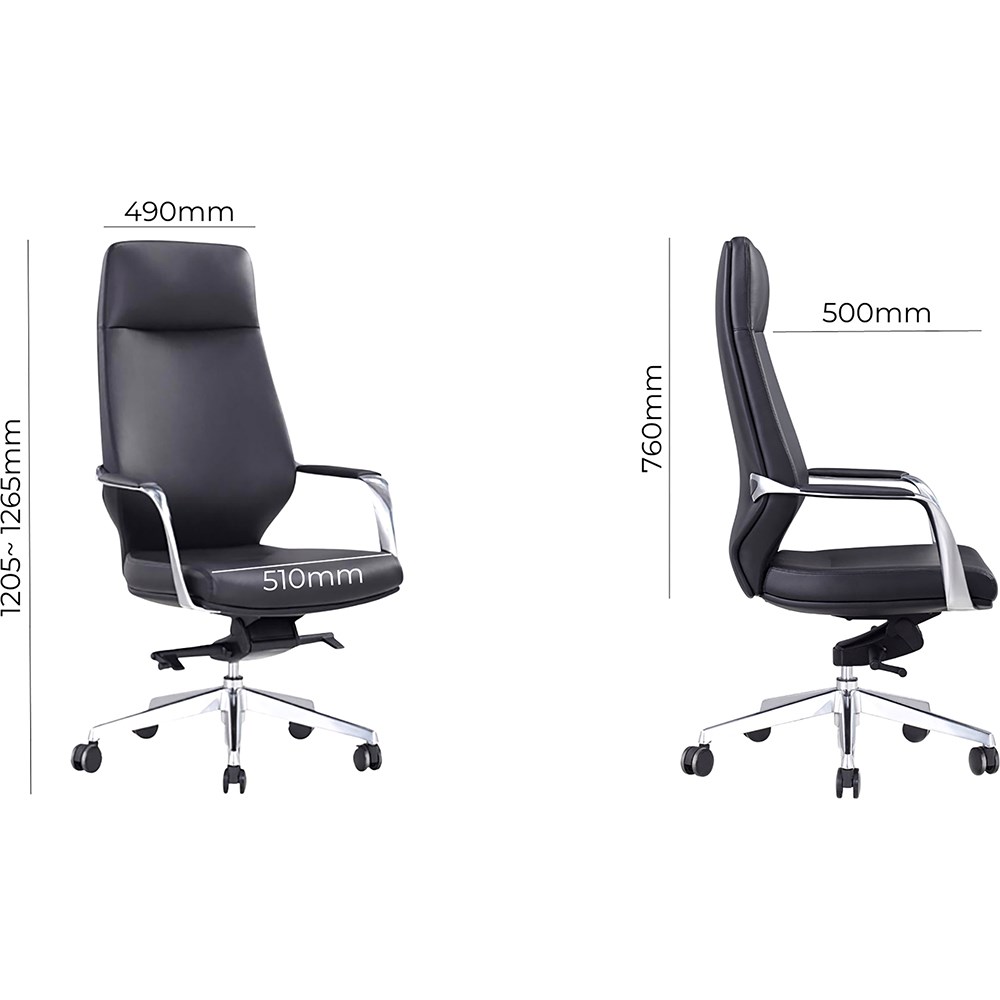 Weight Rating: 160kg. Executive Knee Tilt Synchro Mechanism - 4 Locking Positions. Chair Dimension: Seat Width 500mm, Seat Depth 520mm, Back Height: 760mm, Overall Height 840mm-1050mm. Indicative Seating Time: 8 hours. Premium Genuine Leather Upholstery in Black. Aluminium Arms with Genuine Leather Padding. Class 4 HD gas lift and Luxury Alloy Base. 60mm Executive PU castors. 7 Years Manufacturer's Warranty. Delivery, installation and assembly charges may apply to furniture. Please enquire to confirm.
