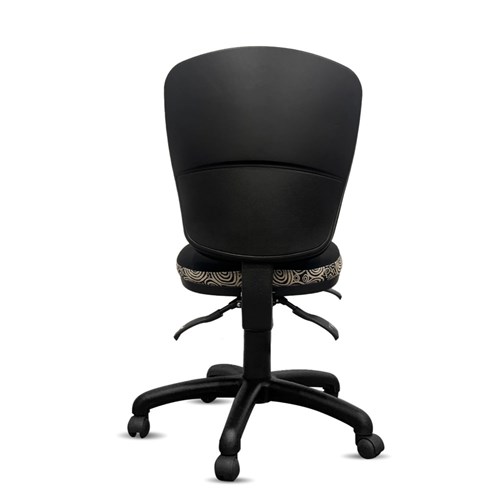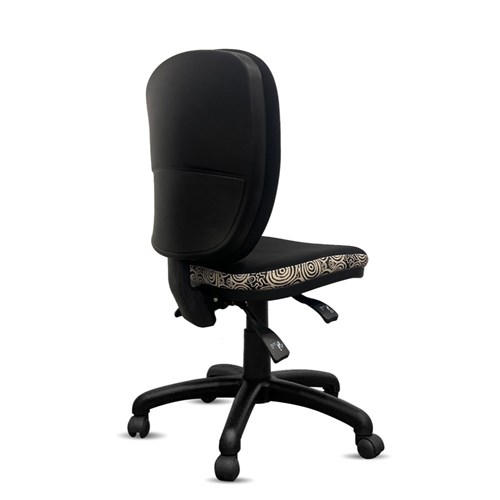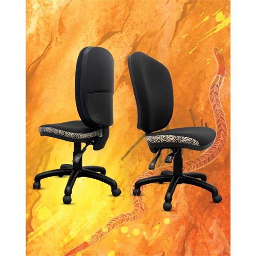 A unique commercial fabrics designed by Nelly Patterson (Indigenous Artist) combined with K2 Black Fabric to upholster the chair. Weight rating: AFRDI Rated Load 160kg Approved. Indicated seat hours: 24/7. Seat Dimensions: 510W x 490D x 460-590mmH. Back Height: 460mm. Back Width: 460mm. Heavy duty commercial chair with 3 lever mechanism and ratchet back height adjustment. 5 way 700mm commercial grade nylon base. Heavy duty gas lift cylinder. Moulded seat foam for supreme comfort. Fire retardant contoured moulded foam. Product image for reference only. Design pattern may differ as a result of variations in the art work. 10 Year Years Manufacturer's Warranty. Delivery, installation and assembly charges may apply to furniture. Please enquire to confirm. Optional adjustable armrest available. Refer to product code 3043352.
