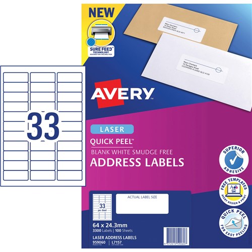 SureFeed™ technology is engineered to help provide a more reliable feed through your printer. Address Labels have Quick Peel™ Pop-up Edge™ making peeling the label faster and easier, simply bend back the sheet and the edge pops up, just peel and apply 12-65 up. Jam-Free reliability for trouble free printing, saving time and minimising wastage. Labels use Opaque TrueBlock® technology which completely covers everything underneath. Customise your labels with Avery Design and Print, available at averyproducts.com.au/print. FSC® certified labels made with paper from well-managed forests. Made in Australia. Size: 64x24.3mm 3300 labels, 100 sheets, 33 labels per sheet (33UP).