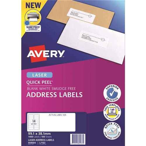 Avery Quick Peel Address Laser White L7163 99.1x38.1mm 14UP 1400 Labels 100 Sheets