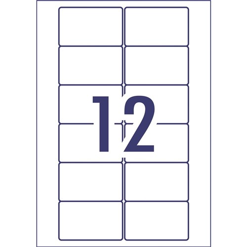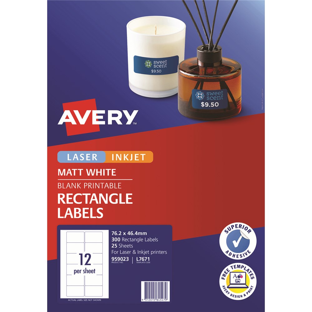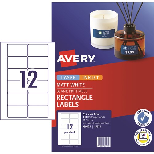 Permanent adhesive sticks to multiple surfaces like glass, metal, paper and plastic. Guaranteed jam free printing on laser printers. Compatible with Laser and Inkjet printers. Customise your labels with Avery Design and Print, available at averyproducts.com.au/print. Size: 76.2x46.4mm 300 labels, 25 sheets. 12 labels per sheet (12UP).