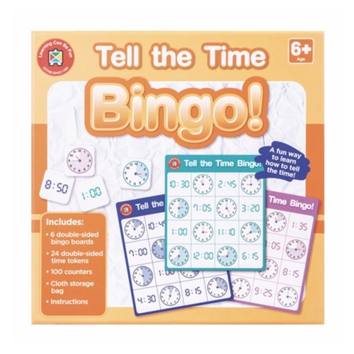 A valuable resource to encourage learning through play. This easy-to-play game will help teach children how to tell the time on both an analogue and digital clock. Includes: 6 double-sided bingo boards, 24 double-sided time tokens, 100 counters, cloth storage bag and instructions.