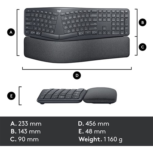 ERGO K860's curved keyframe places your hands, wrists, fingers and forearms in a more natural posture. You will type more naturally with a curved, split keyframe that improves typing posture. Connect your keyboard and mouse with one tiny Logitech Unifying USB receiver. Dimensions: 233H x 456W x 48mmD. Weight: 1160g . 1 Year Manufacturer's Warranty.