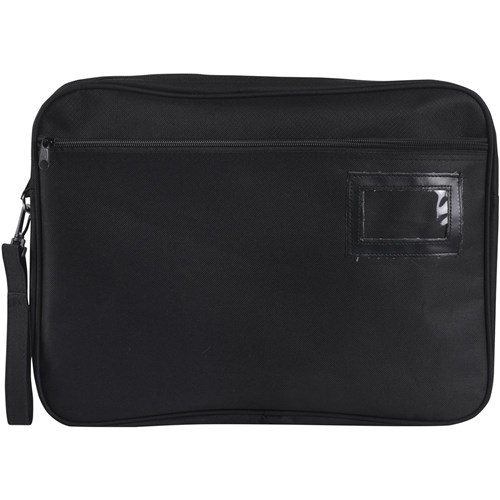 Fabric case with zip closure for keeping documents secure. Ideal for conferences, meetings and presentations. Includes clear business card pocket on the front for identification. Made from durable, long-lasting fabric with bound edging for strength. Also includes an additional zippered pocket on the front for extra storage. Removable carry strap for easy transportation. Holds foolscap size documents.