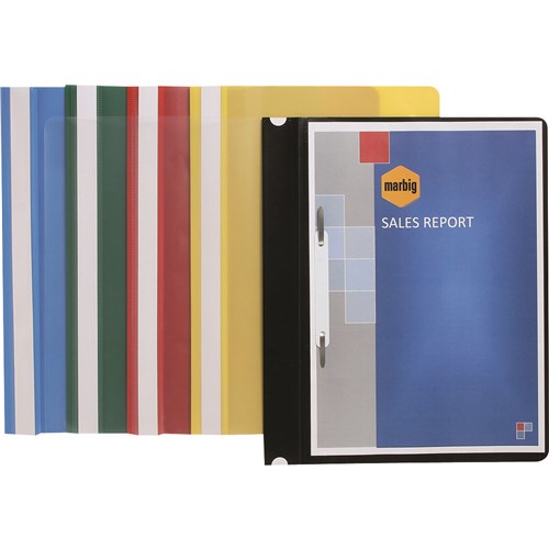 Clear front cover. Features 2 prong fastener to secure papers. Full length title strip to identify contents. Simply punch papers and insert.