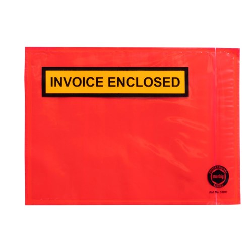 Self Adhesive superior grade adhesive and polyethylene prevent crinkling and sticking to itself. Larger size for multiple documents. Yellow and black print 'invoice enclosed'. Red background.