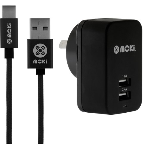 Moki Type-C SynCharge 150cm Braided Cable + Wall Charger Black