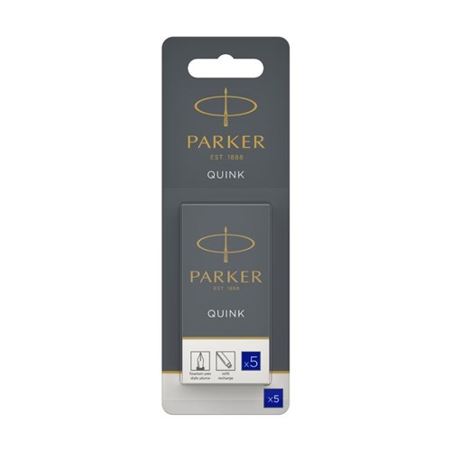 Ink refill cartridges designed exclusively for Parker Fountain pens. Convenient long cartridge keeps ink contained for effortless refilling. Richly pigmented ink makes a vivid impression on the page. Cartridge design allows you to easily use your fountain pen wherever you are. Includes 5 blue ink refills.
