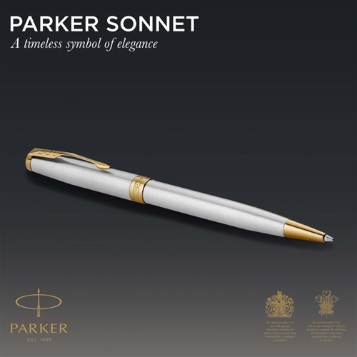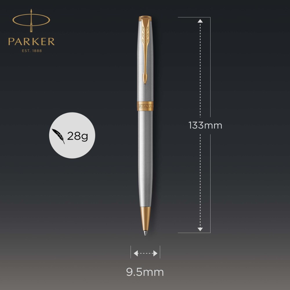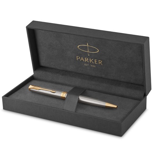 Stainless steel cap and barrel accented by gold-finished clip and trim. Ballpoint design with retractable twist mechanism and medium tip. Hand assembled and checked for flawless quality. Available in a range of beautiful designs and finishes. Packaged in a Parker premium gift box. 2 Year Manufacturer's Warranty.
