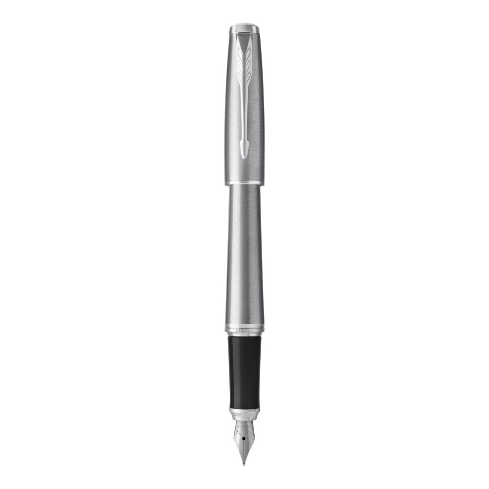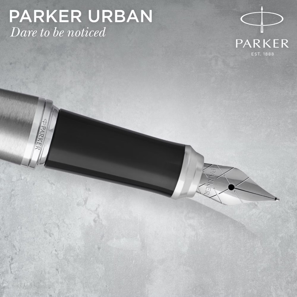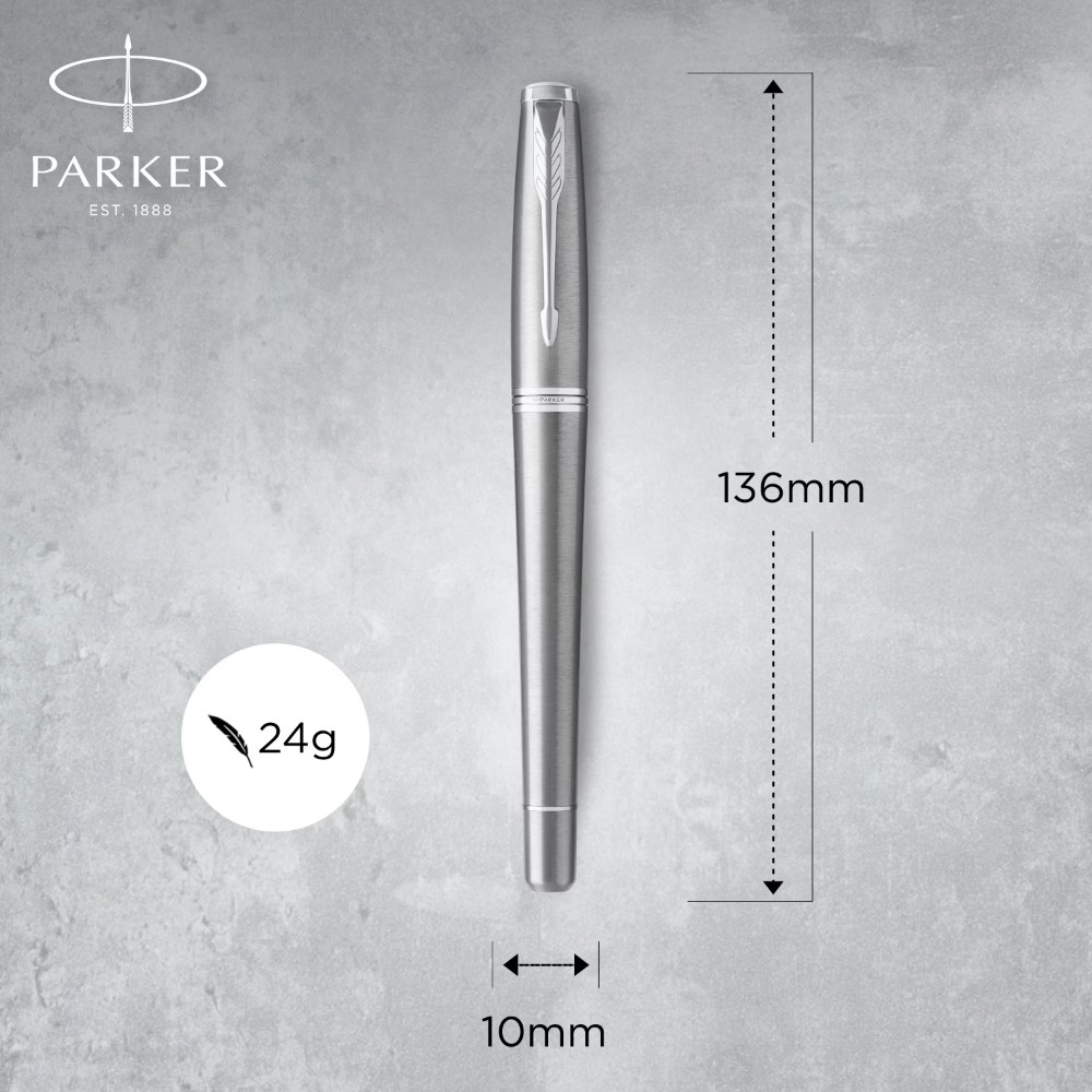 Sleek hourglass curves offer a bold modern look. Metallic finish with a lightly brushed touch complemented by chrome trim and the signature Parker arrow clip. Durable engraved stainless steel nib delivers a dependable and personal writing experience. Ergonomic shape conforms to your natural grasp, providing the perfect weight and balance. Packaged in a distinctive Parker gift box. For use with QUINK ink cartridges or convertible to ink bottle filling. 2 Year Manufacturer's Warranty.