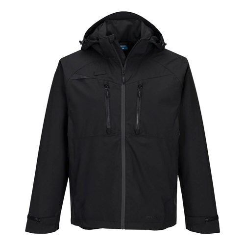 Waterproof breathable fabric with taped seams. PFAS-free Texpel Splash Eco finish repels water. Reflective tape for visibility. Adjustable hem and cuffs. Detachable hood and chin guard. Multiple zipped and internal pockets. Radio loop and easy grip pullers. Active ergonomic fit with curved back hem. Pre-bent sleeves, bartacked seams, certified design. Fabric: Portwest Extreme 100% Polyester Stretch 150D PU Membrane 160g; Lining: 100% Polyester Mesh 125g.