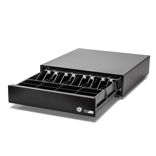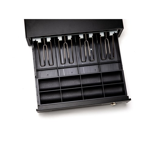A receipt printer is not required. There are 4 note holders, 8 coin trays for organising currency. It has a durable steel casing. There is a 2-position lock for added security, with 2 keys included. It is colour matched with under counter brackets. The dimensions are 330W x 360D x 90mmH with 80mm cash drawer and 10 mm feet. The cash drawer is a classic black colour. 1 Year Manufacturer's Warranty.