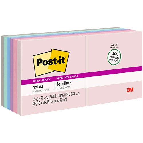 These Post-it Super Sticky Notes Recycled Notes have 2 times the sticking power. Ideal for vertical and had to stick surfaces. Stick and re-stick so your thoughts get noticed. Use for reminders on doors, windows and walls. Made with 30% recycled paper. 70 sheets per pad. Recyclable.
