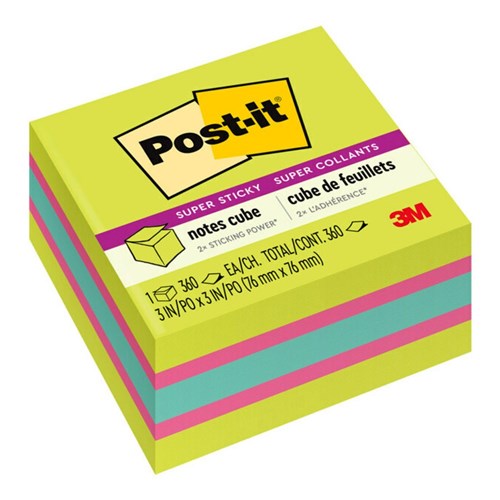 Post-it Super Sticky Notes have 2X the sticking power 76mm x 76mm Cube, Assorted colours Leave a cube on your desk so you always have a note close by Post-it Super Sticky Notes are recyclable Great for reminders and short notes The paper in Post-it Super Sticky Notes is sourced from certified, renewable and responsibly managed forests Memo cube is made up of the following Colours: Neon Green 90 sheet, Fireball Fuchsia 45 sheet, Aqua Wave 90 sheet, Fireball Fuchsia 45 sheet, Neon Green 90 sheet