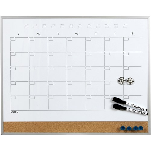 This 3-In-1 Calendar Combination Board has everything you need for planning the busy month ahead. Features a dry-erase calendar, magnetic surface and cork bulletin board strip along the bottom to keep your monthly schedule on track. Dry-erase surface is printed with an undated monthly calendar with the days of the week listed Sunday through Saturday. Cork strip along the bottom of the board allows you to securely tack papers and photos alongside the frame. Dry-erase surface is magnetic for posting business cards, reminders and more. 510 x 410 aluminium slim framed board. Includes 2 x magnets, 2 x Quartet markers and 4 push pins. Mounting tapes included.