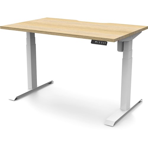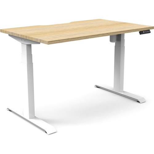 Natural Oak top with White frame. Unit Dimension: 1200mm W x 750mm D x 620-1270mm H. E0 rated top. Powdercoat base. Digital control panel with 3 pre-set positions, LED display panel, keypad safety lock & reminder alarm setting. Anti-collision technology, noise emission of less than 50DB. Lifting capacity of 80kg with a max speed of 25mm per second. 700mm wide foot size with adjustable leveling feet. 10 Year Manufacturer's Warranty. Delivery, installation and assembly charges may apply to furniture. Please enquire to confirm.