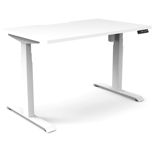 White top with White frame. Unit Dimension: 1200mm W x 750mm D x 620-1270mm H. E0 rated top. Powdercoat base. Digital control panel with 3 pre-set positions, LED display panel, keypad safety lock & reminder alarm setting. Anti-collision technology, noise emission of less than 50DB. Lifting capacity of 80kg with a max speed of 25mm per second. 700mm wide foot size with adjustable leveling feet. 10 Year Manufacturer's Warranty. Delivery, installation and assembly charges may apply to furniture. Please enquire to confirm.