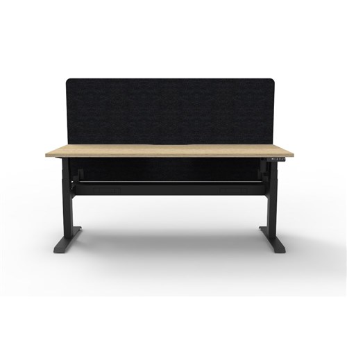Electric height adjustable single sided workstation with Natural Oak top and Black Satin frame, Black Eco screen and cable tray. Unit Dimension: 1500W x 750D x 1330mmH (Overall). Desk Height: 620-1270mmH. Eco panel screen 1500W x 900H x 27mmT. Fully ducted cable tray with punchout for power and data to be fitted to either external or internal of frame. 80mm rear scallop cut out. E0 rated 25mm top. Single motor underframe finished in powder coat with steel gauges 3.0mm, 2.0mm and 1.5mm. Digital control panel with 3 preset positions, LED display, keypad safety lock and reminder alarm. Anti-collision and anti-tilt technology. Lifting capacity 80kg, max speed 25mm per second. Noise emission