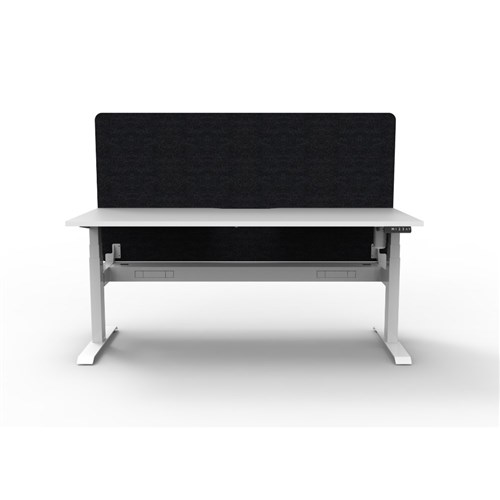 Electric height adjustable single sided workstation with Natural White top and White Satin frame, Black Eco screen and cable tray. Unit Dimension: 1500W x 750D x 1330mmH (Overall). Desk Height: 620-1270mmH. Eco panel screen 1500W x 900H x 27mmT. Fully ducted cable tray with punchout for power and data to be fitted to either external or internal of frame. 80mm rear scallop cut out. E0 rated 25mm top. Single motor underframe finished in powder coat with steel gauges 3.0mm, 2.0mm and 1.5mm. Digital control panel with 3 preset positions, LED display, keypad safety lock and reminder alarm. Anti-collision and anti-tilt technology. Lifting capacity 80kg, max speed 25mm per second. Noise emission