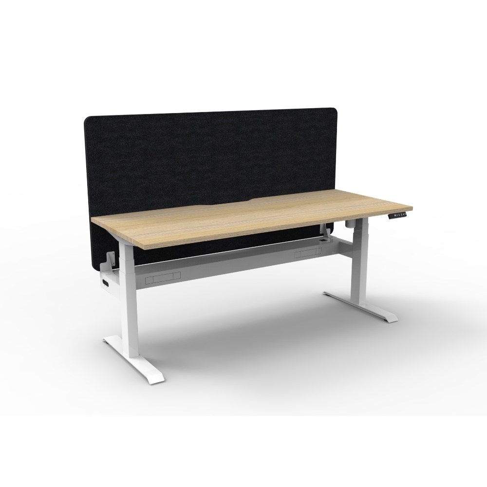 • Electric height adjustable single sided workstation with Natural Oak top and White Satin frame, Black Eco screen and cable tray.