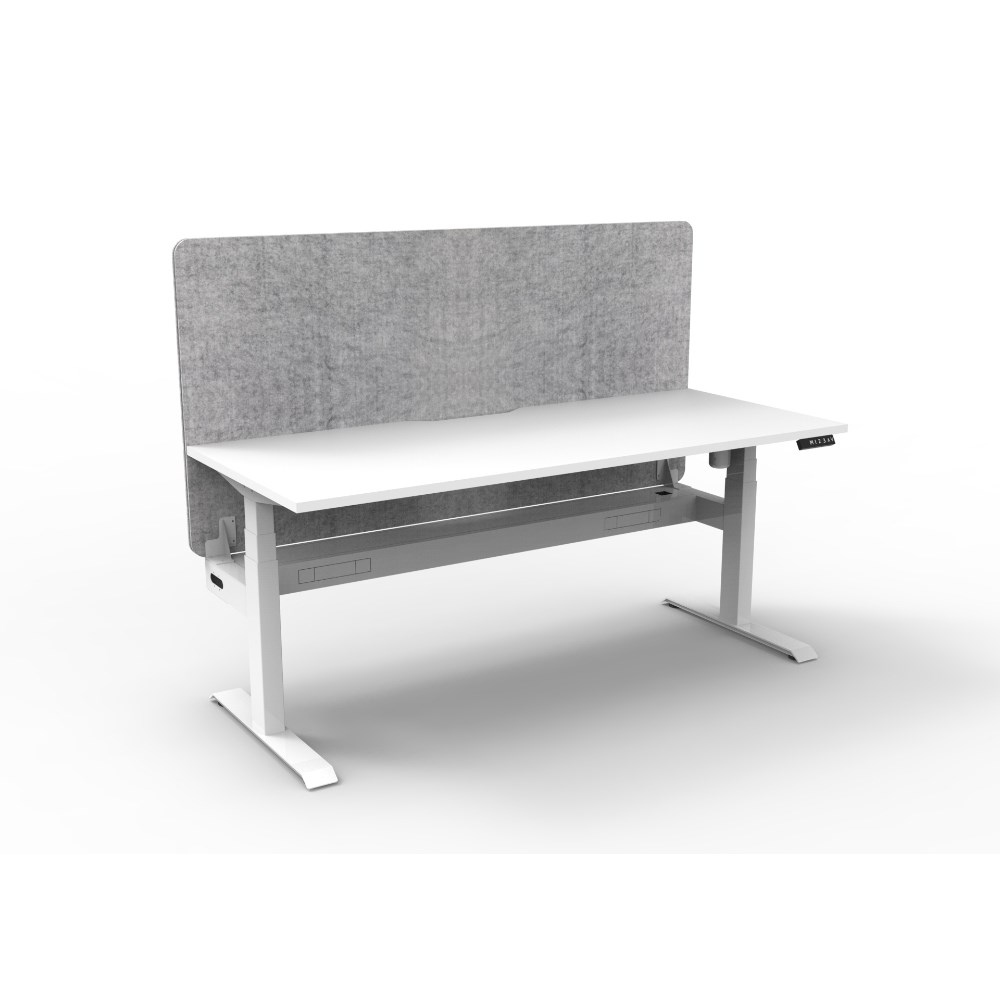 • Electric height adjustable single sided workstation with Natural White top and White Satin frame, Grey Eco screen and cable tray.
