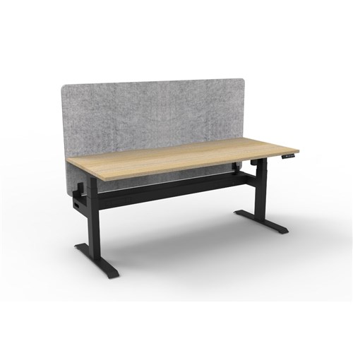 • Electric height adjustable single sided workstation with Natural Oak top and Black Satin frame, Grey Eco screen and cable tray.