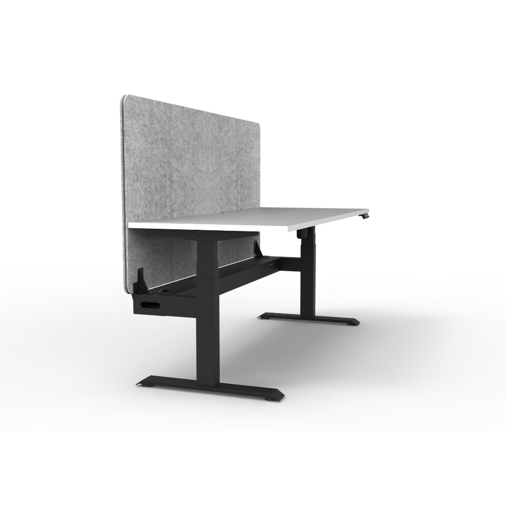 • Electric height adjustable single sided workstation with Natural White top and Black Satin frame, Grey Eco screen and cable tray.