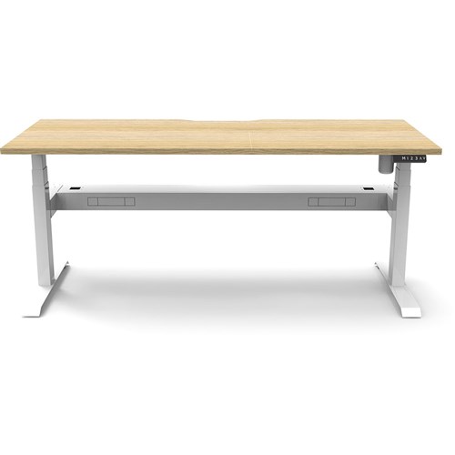 Natural Oak top with White frame. Unit Dimension: 1800mm W x 750mm D x 620-1270mm H. Comes with cable tray for cable management. E0 rated top. Powdercoat base. Digital control panel with 3 pre-set positions, LED display panel, keypad safety lock & reminder alarm setting. Anti-collision technology, noise emission of less than 50DB. Lifting capacity of 80kg with a max speed of 25mm per second. 700mm wide foot size with adjustable leveling feet. 10 Year Manufacturer's Warranty. Delivery, installation and assembly charges may apply to furniture. Please enquire to confirm.