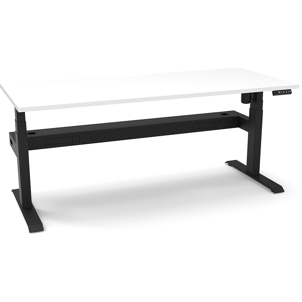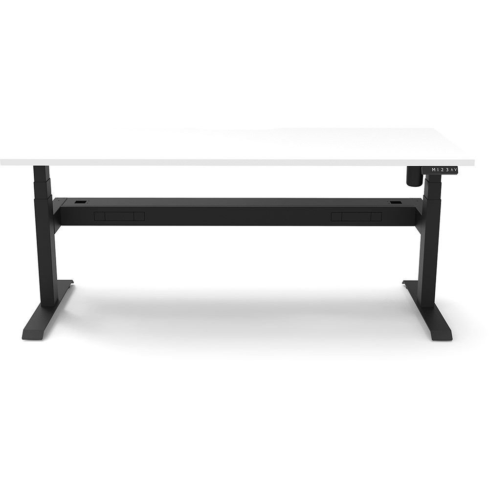 White top with Black frame. Unit Dimension: 1800mm W x 750mm D x 620-1270mm H. Comes with cable tray for cable management. E0 rated top. Powdercoat base. Digital control panel with 3 pre-set positions, LED display panel, keypad safety lock & reminder alarm setting. Anti-collision technology, noise emission of less than 50DB. Lifting capacity of 80kg with a max speed of 25mm per second. 700mm wide foot size with adjustable leveling feet. 10 Year Manufacturer's Warranty. Delivery, installation and assembly charges may apply to furniture. Please enquire to confirm.