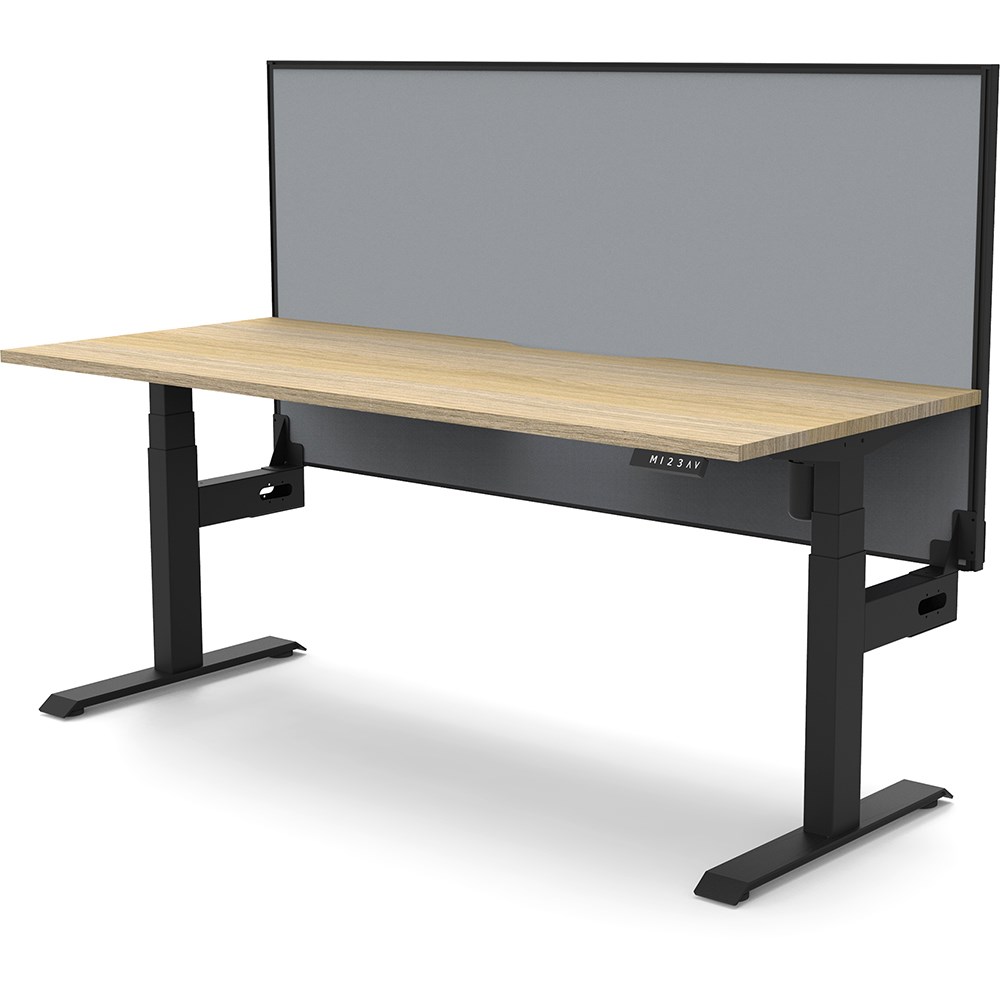 Natural Oak top with Black frame. Unit Dimension: 1800mm W x 750mm D x 1330mm H. 620-1270mm height range for desk. E0 rated top. Powdercoat base. Digital control panel with 3 pre-set positions, LED display panel, keypad safety lock & reminder alarm setting. Anti-collision technology, noise emission of less than 50DB. Lifting capacity of 80kg with a max speed of 25mm per second. 700mm wide foot size with adjustable leveling feet. Comes with 30mm thick privacy screen. 10 Year Manufacturer's Warranty. Delivery, installation and assembly charges may apply to furniture. Please enquire to confirm.