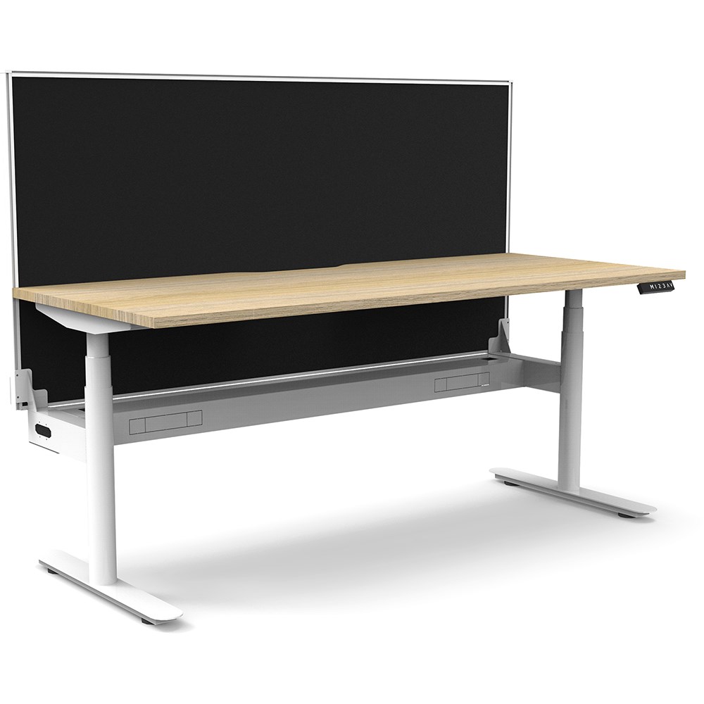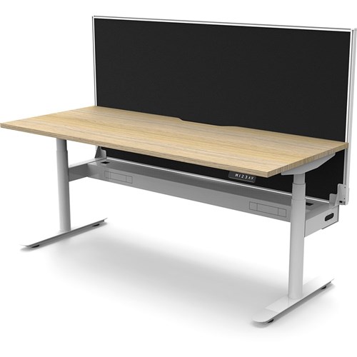 Natural Oak top with White frame. Unit Dimension: 1500mm W x 750mm D x 1330mm H. 620-1270mm height range for desk. E0 rated top. Powdercoat base. Digital control panel with 3 pre-set positions, LED display panel, keypad safety lock & reminder alarm setting. Anti-collision technology, noise emission of less than 50DB. Lifting capacity of 120kg with a max speed of 38mm per second. 70mm diameter round column legs. 700mm wide foot size with adjustable leveling feet, return foot: 700mm. Comes with 30mm thick privacy screens and cable tray for cable management. 10 Year Manufacturer's Warranty. Delivery, installation and assembly charges may apply to furniture. Please enquire to confirm.