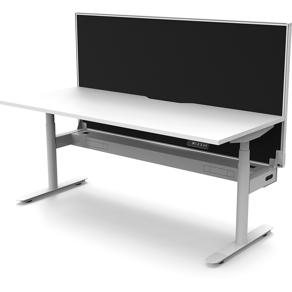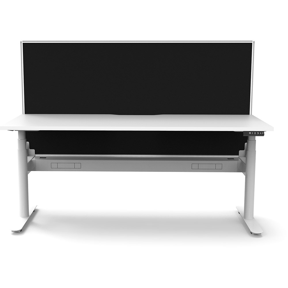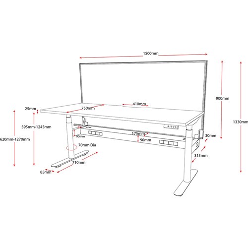 White top with White frame. Unit Dimension: 1500mm W x 750mm D x 1330mm H. 620-1270mm height range for desk. E0 rated top. Powdercoat base. Digital control panel with 3 pre-set positions, LED display panel, keypad safety lock & reminder alarm setting. Anti-collision technology, noise emission of less than 50DB. Lifting capacity of 120kg with a max speed of 38mm per second. 70mm diameter round column legs. 700mm wide foot size with adjustable leveling feet, return foot: 700mm. Comes with 30mm thick privacy screens and cable tray for cable management. 10 Year Manufacturer's Warranty. Delivery, installation and assembly charges may apply to furniture. Please enquire to confirm.