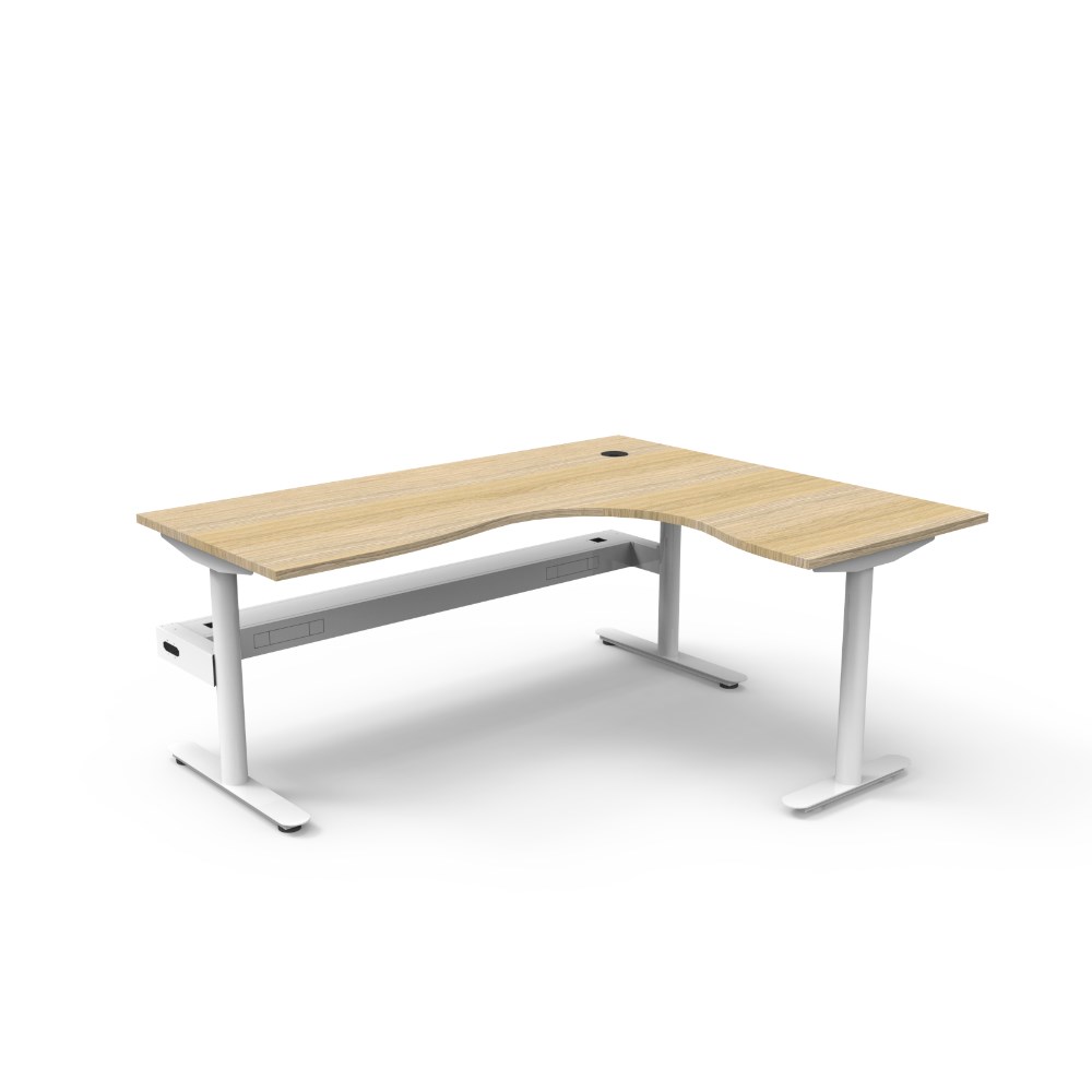 Natural Oak top White Satin frame. Corner workstation with cable tray. Dimensions: 1800W x 1500W x 750D x 730mmH. E0 rated 25mm top with rigid edging and 80mm diameter cable entry with cover. Powder coated underframe. Adjustable levelling feet. 10 Year Manufacturer's Warranty. Delivery, installation and assembly charges may apply to furniture. Please enquire to confirm.