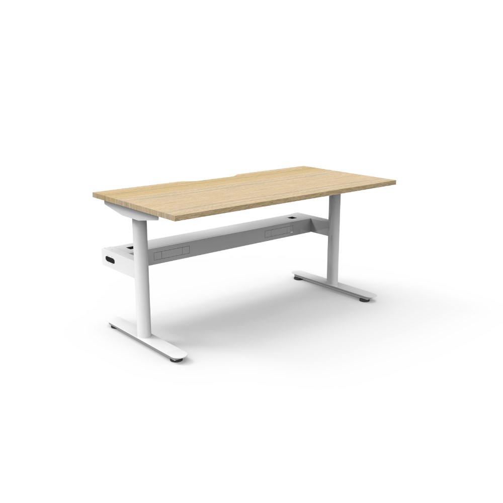 Natural Oak top White Satin frame. Single workstation with cable tray. Dimensions: 1500W x 750D x 730mmH. E0 Rated 25mm top with rigid edging and 50mmD scallop cut out for efficient cable management, while the fully ducted cable tray ensures cords stay organised. Powder coated underframe. Adjustable levelling feet. 10 Year Manufacturer's Warranty. Delivery, installation and assembly charges may apply to furniture. Please enquire to confirm.