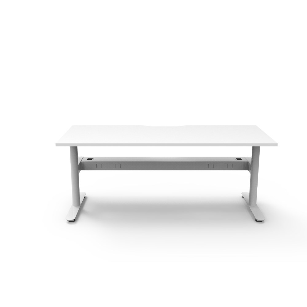 Natural White top White Satin frame. Single workstation with cable tray. Dimensions: 1800W x 750D x 730mmH. E0 Rated 25mm top with rigid edging and 50mmD scallop cut out for efficient cable management, while the fully ducted cable tray ensures cords stay organised. Powder coated underframe. Adjustable levelling feet. 10 Year Manufacturer's Warranty. Delivery, installation and assembly charges may apply to furniture. Please enquire to confirm.