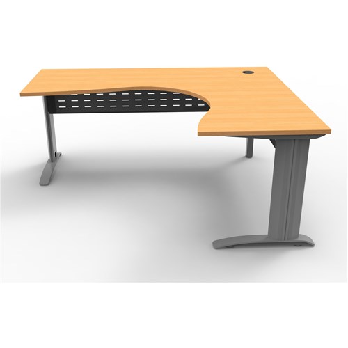 One piece corner workstation with 25mm top. Sturdy powder coated frame and legs. Comes with metal perforated modesty panel and cable tidy. E0 Enviroboard top. 1 x 80mm cable entry hole in corner of top. Adjustable feet. 5 Years Manufacturer's Warranty. Delivery, installation and assembly charges may apply to furniture. Please enquire to confirm.