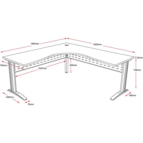 One piece corner workstation with 25mm top. Sturdy powder coated frame and legs. Comes with metal perforated modesty panel and cable tidy. E0 Enviroboard top. 1 x 80mm cable entry hole in corner of top. Adjustable feet. 5 Years Manufacturer's Warranty. Delivery, installation and assembly charges may apply to furniture. Please enquire to confirm.
