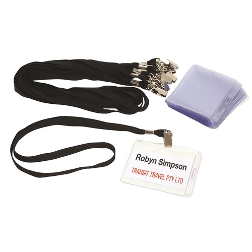 Contains all you need to create identification for up to 50 people. Includes 50 x flat lanyards with alligator clip, 50 x ID card holders pre-punched for use landscape or portrait and 50 x blank software compatible insert cards. Black lanyard, clear card holders.