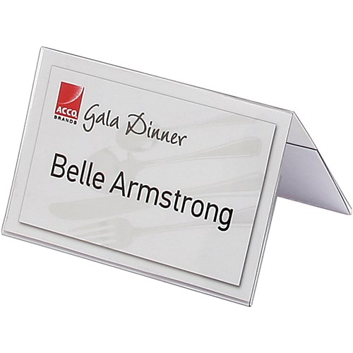 Clear plastic name plates with insertable cards to display titles, names etc. Ideal for use in meetings, training sessions, conferences etc. A4 insert card width, scored for large and small name plates. Software compatible - preformatted templates available at www.acco.com.au.