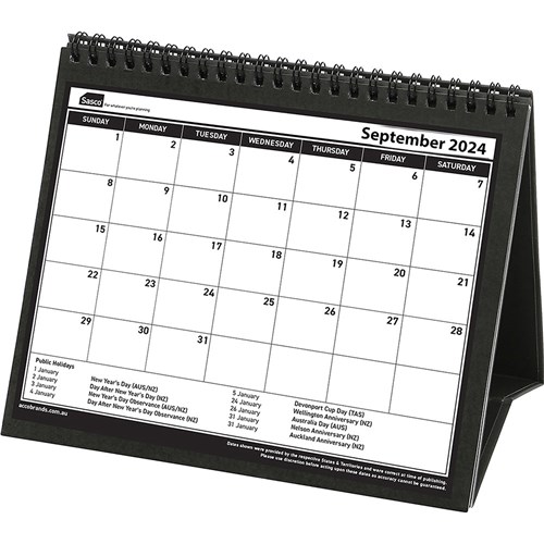Stylish desk calendar to sit on your desk at the office or at home Two options available- black viewing pages or white (on reverse side) One month per page format National public holidays (Australia and NZ) included Folds open to stand by itself on desktop