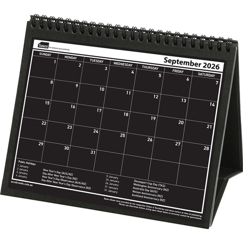Stylish desk calendar to sit on your desk at the office or at home. Two options available- black viewing pages or white(on reverse side). One month per page format. National public holidays (Aust and NZ) included. Folds open to stand by itself on desktop. Compact and durable construction desk calendar with twin wire-o binding. Ample space for jotting down notes, appointments, or personal reminders. Dimensions: 210 x 180mm. FSC Certified.
