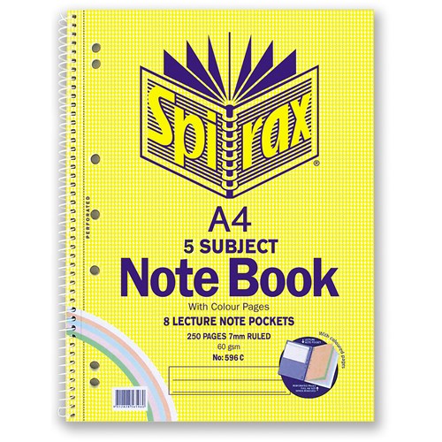 5 subject A4 book with coloured pages per subject. Includes 4 cardboard dividers that separate a group of pages. 7mm ruled lines. Pockets provide storage area for loose notes. Side opening. 7 hole punched for use in 2,3 or 4 ring binders. Perforated pages allow you to remove and file paper with ease. Red ruled margin. This Spirax Notebook is now compatible with the free Spirax Study App where you can store your notes digitally and create instant digital flashcards.