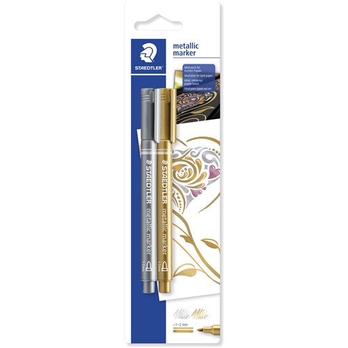 Staedtler® vibrant water based metallic markers. Smooth writing first time, everytime without shaking or pumping. Perfect for certificate writing, scrapbooking and greeting cards.