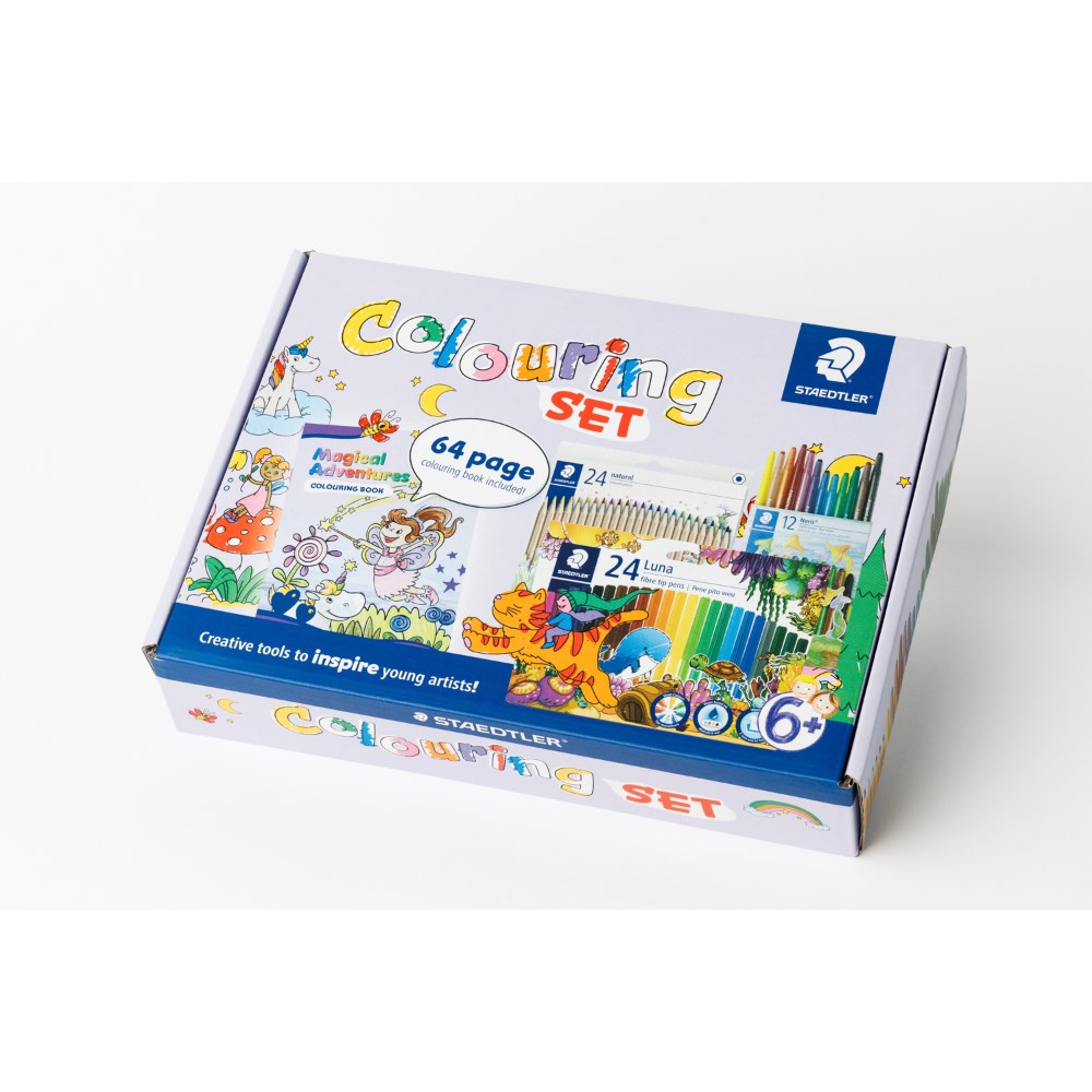• Includes 64 page colouring book, 24 Natural Coloured Hexagonal Pencils, 12 Noris Wax Twister Crayons and 24 Luna Fibre-Tip Pens.