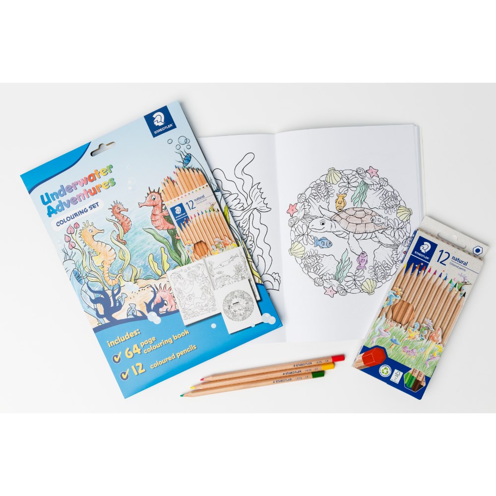 Contains Staedtler Natural Colour Pencils with a 64 page colouring book filled with great adventures. Includes 64 page colouring book and 12 x Pack coloured pencils. Recommended age: 3 years+. Colouring book size: B5 250mm x 176mm. Pencils use wood from certified, sustainably managed forests.