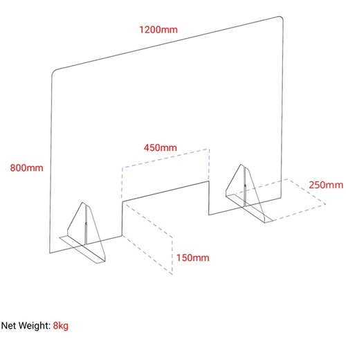 An ideal solution for infection control. Lightweight and removable. Comes with 2 mounting feet and 2 strips of double sided tape to quick and easy installation. Transactional window. Transaction Slot: 450 x 150mm. Full Dimension: 1200W x 800mmH. Mounting Stand: 250mm length.