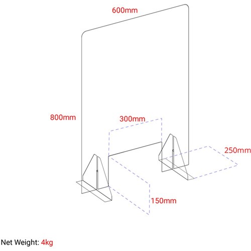 An ideal solution for infection control. Lightweight and removable. Comes with 2 mounting feet and 2 strips of double sided tape to quick and easy installation. Transactional window. Transaction Slot: 300 x 150mm. Full Dimension: 600W x 800mmH. Mounting Stand: 250mm length.